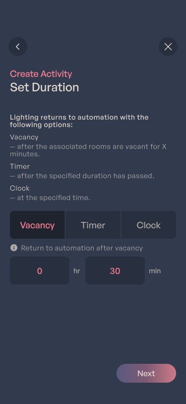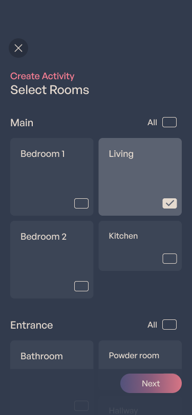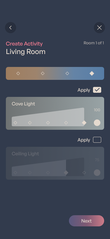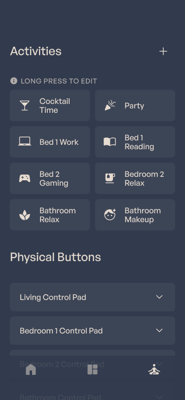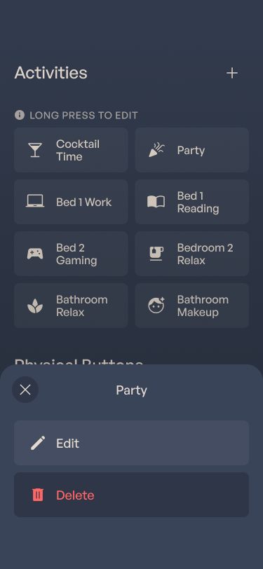 Activities allow you to temporarily apply a custom lighting environment tailored to your preferences or specific situations, independent of automation settings.