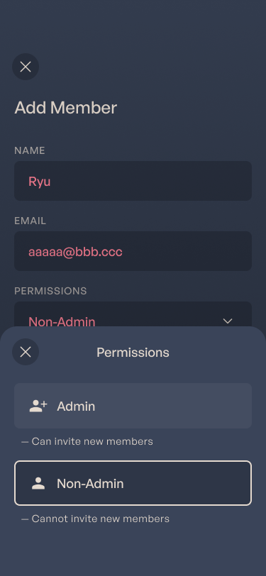 Enter the person's name, email address, and permission level (Admin or Non-admin), then tap “Invite”.