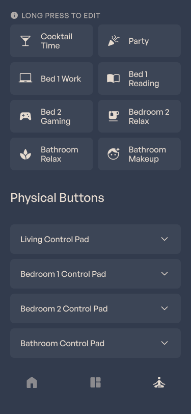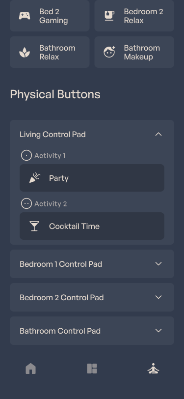 A control pad is installed in main rooms, allowing quick access to activities, automation toggle, and turning off lights for bedtime.