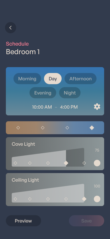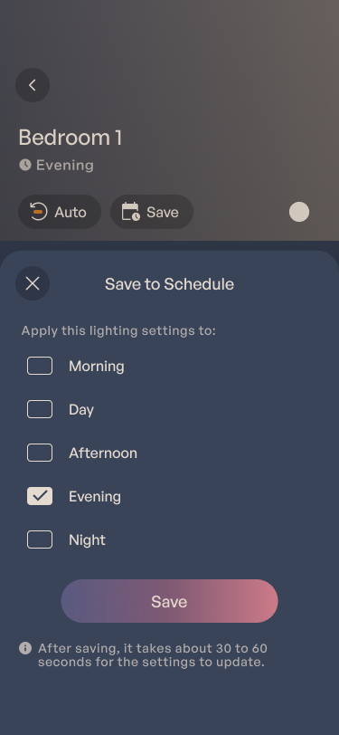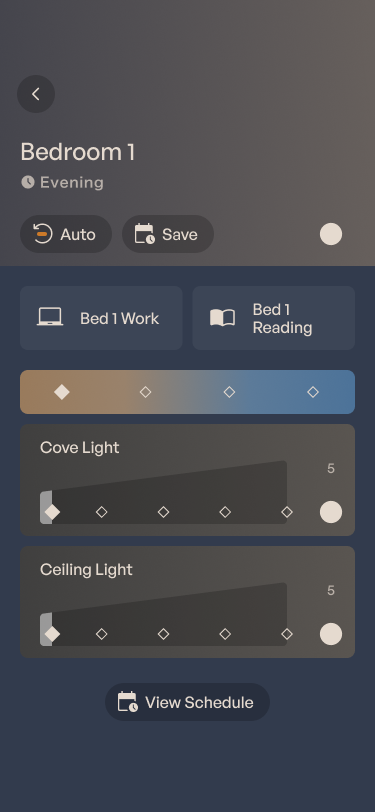 You can open the lighting automation settings screen by tapping the “Schedule” button in each room’s detail screen.