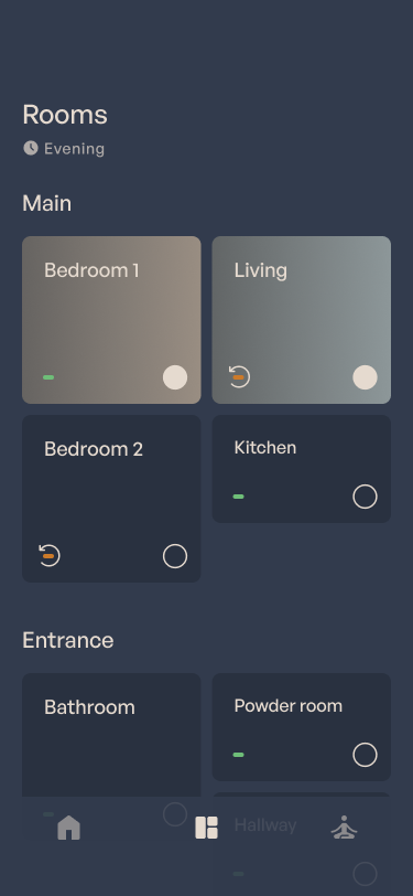 View the status of each room at a glance. You can control lights individually and adjust automation settings for each room.