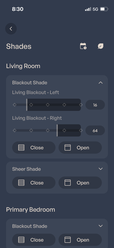 The blackout and sheer shades in each room can be opened and closed together. You can also tap the arrow on the right to display a detailed slider and adjust each shade individually.