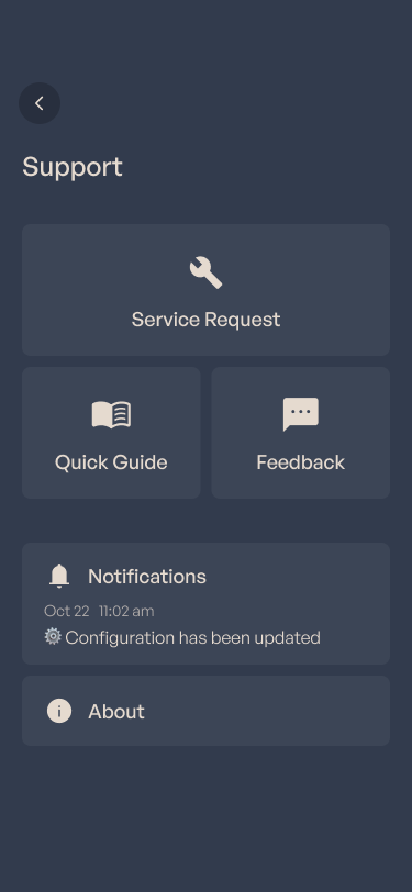 This screen allows quick access to frequently used features. You can check the current lighting status, control the air conditioner, and access support.