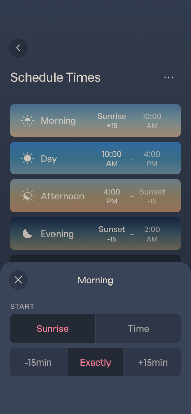 *Sunrise and sunset times are automatically calculated based on the property's latitude and longitude, and will vary by season.